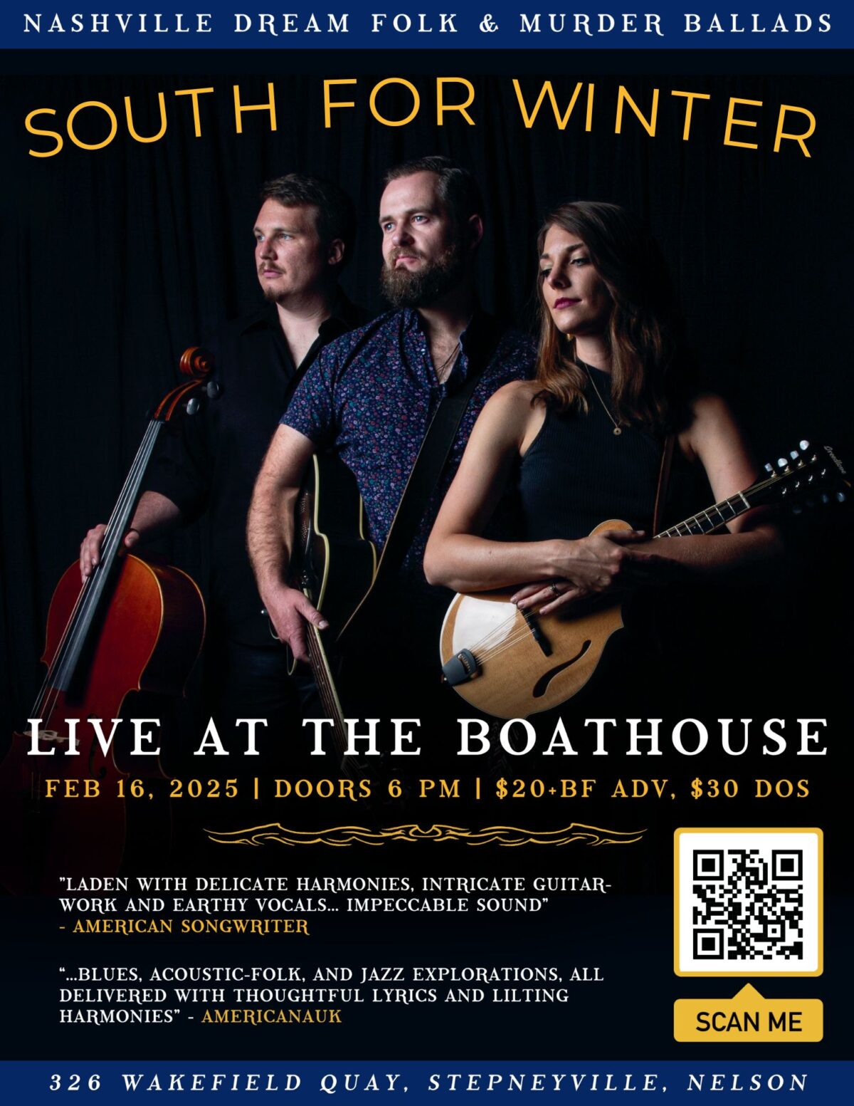 South For Winter Sunday 16th February, 7pm Click HERE to get tickets $20 Early Bird Dinner service from 5pm With a blend of dreamy acoustic duets, foot-stomping folk and bluesy murder ballads, New Zealand-formed and Nashville-based trio South for Winterβs sound is as eclectic as their origins. The act is comprised of kiwi Nick Stone, Coloradan Dani Cichon, and Michigander Alex Stradal, and together the three multi-instrumentalists and songwriters combine elements such as percussive acoustic guitar, cello, mandolin, suitcase stomp,…