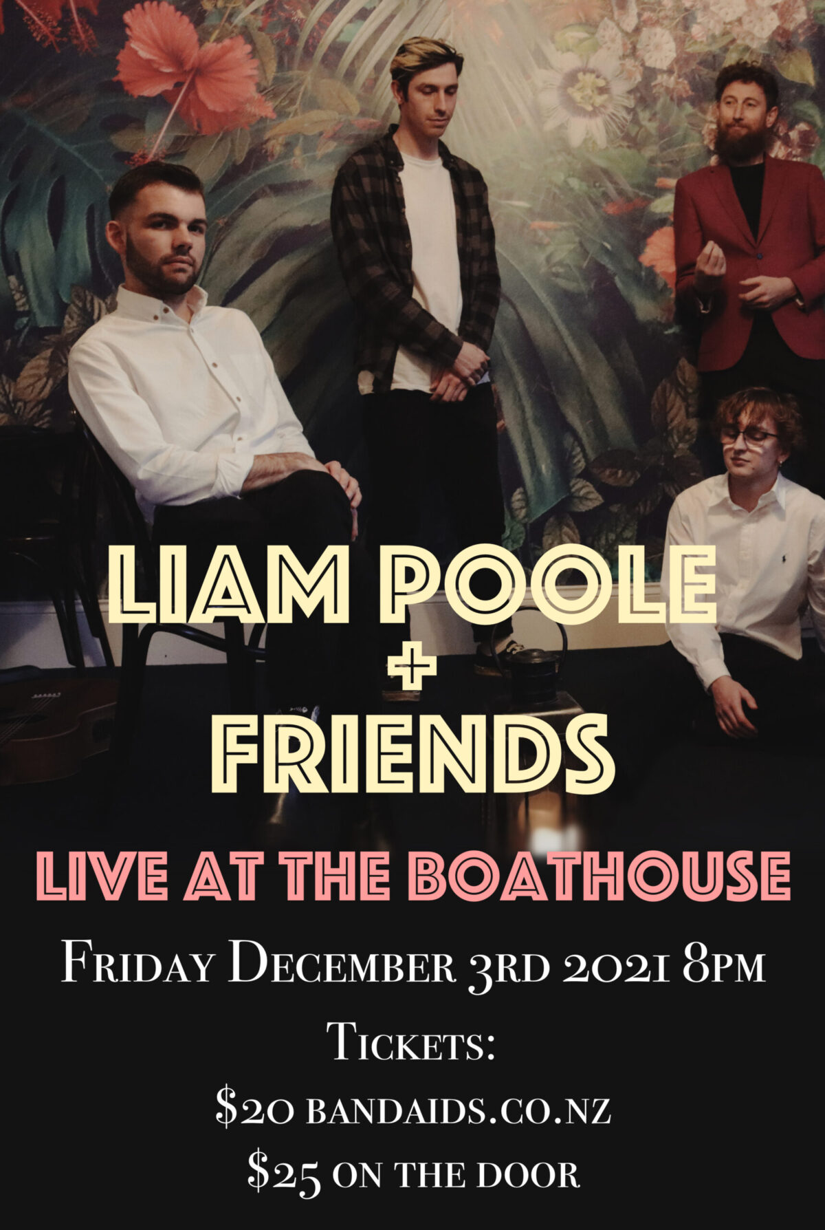 UNFORTUNATELY, THIS EVENT HAS BEEN POSTPONED. Liam Poole + Friends is a 4 piece collective, full of unique individuals who share a love for performing and creating quality live music. The band formed in 2020, and consists of well established local musicians: Liam Poole (Lead Vocals, rhythm guitar), Luke Wilkes (Lead Guitar), Sam Edmonds (Drums), Hayden Stamp (Bass). Bringing you an eclectic mix of songs from artists such as: Bee Gees, Prince, Shawn Mendes, Katy Perry, Fleetwood Mac, as well as Liam…