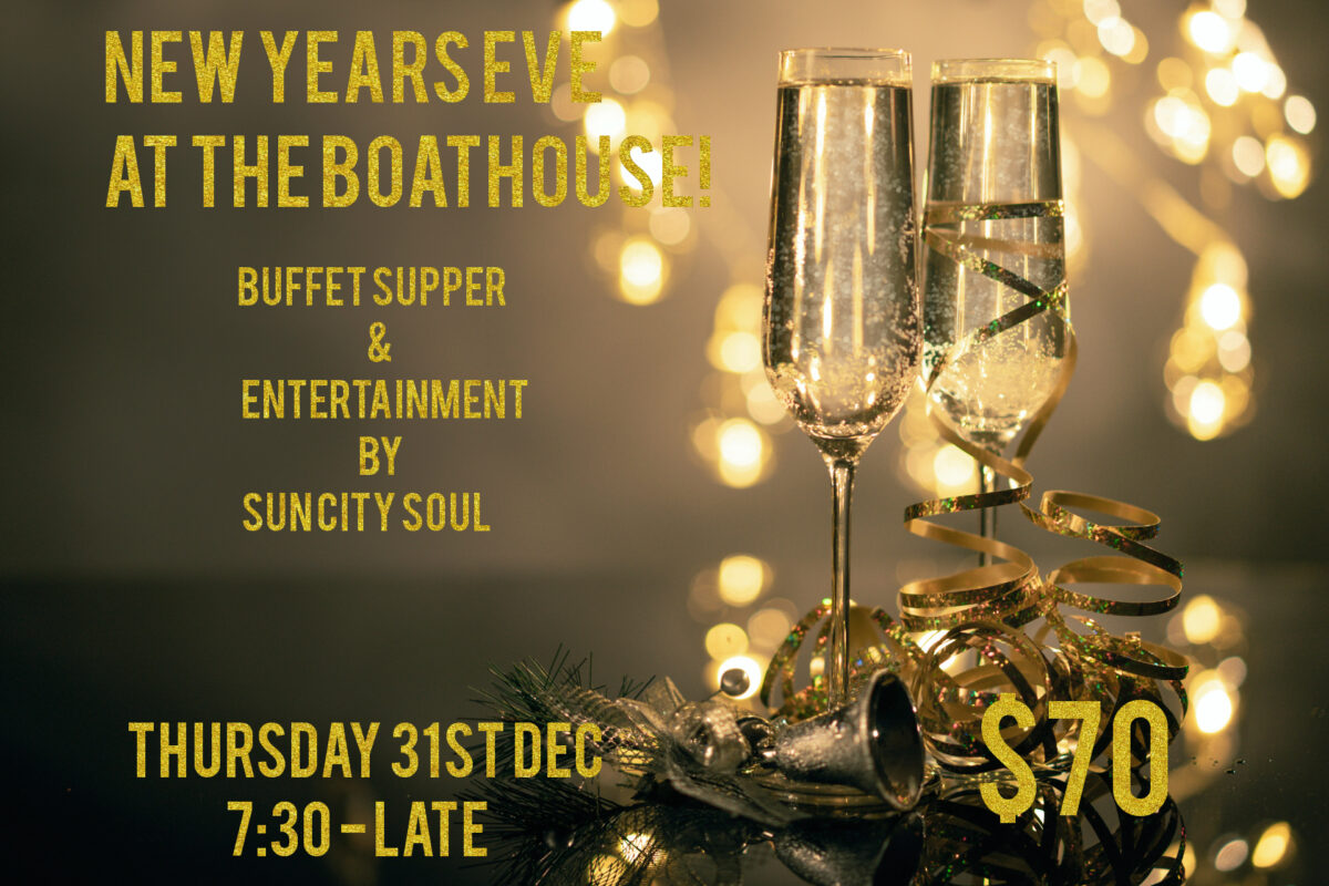 Thursday 31st New Year at The Boathouse Time: 7.30 β Late Tickets: $70 via NelsonTickets.co.nz Join us at The Boathouse Nelson for a fun-packed New Year celebration! With entertainment by the fantastic Sun City Soul and a delicious supper buffet what better location to bring in 2021 than the best deck in Nelson!