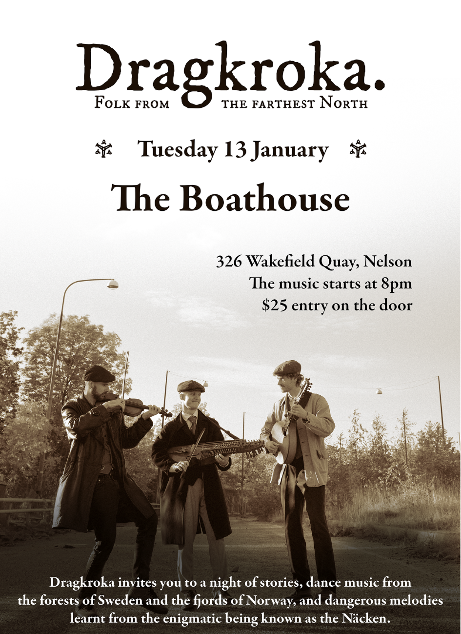 Tuesday February 13, 7:30 pm Tickets HERE _ Amalgo hail from the Nelson and Motueka region, and play with a mix of progressive groove-based, modern Celtic. They bring new interpretations of traditional Celtic music and their own original compositions. Their music is foot-tapping, danceable and steeped in the tradition of instrumental folk music. Come and enjoy and be inspired by Amalgo’s fresh interpretation of the Celtic music legacy at Nelson’s own Boathouse. They play traditional music with a modern flare,…