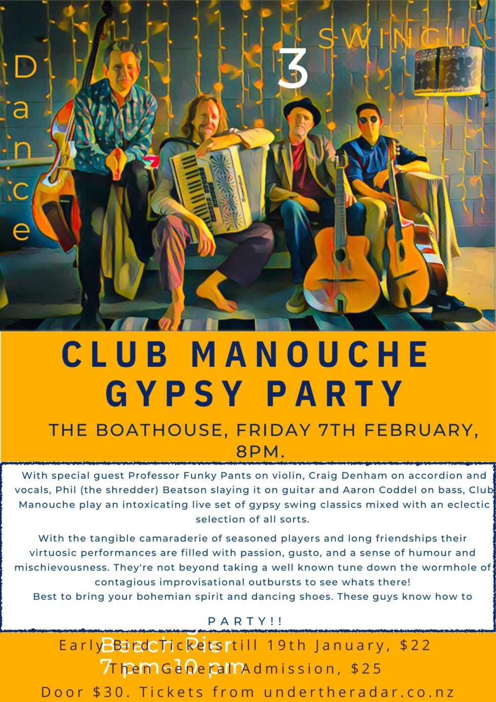 With special guest Professor Funky Pants on violin, Craig Denham on accordion and vocals, Phil (the shredder) Beatson slaying it on guitar and Aaron Coddel on bass, Club Manouche play an intoxicating live set of gypsy swing classics mixed with an eclectic selection of all sorts.