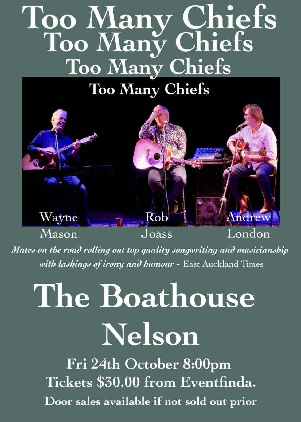 Too Many Chiefs are three of New Zealand’s busiest singer/songwriters: Rob Joass (Hobnail), Andrew London (Andrew London Trio, Hot Club Sandwich) , and Wayne Mason (Fourmula, Warratahs). All tour their own respective shows, sometimes internationally, and once or twice a year come together in Too Many Chiefs to share songs and stories from the road. Their individual influences and performing styles range from blues and jazz to country and folk, often with an element of social commentary, personal reflection and occasional satire.